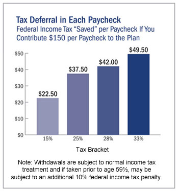 When you save through your plan, you don't have to remind yourself to save, because your contributions are automatically deducted from your paycheck. It's a way for you to pay yourself first, rather than trying to find "extra" money to invest for retirement - after you have paid all of your other bills.Tax Benefits